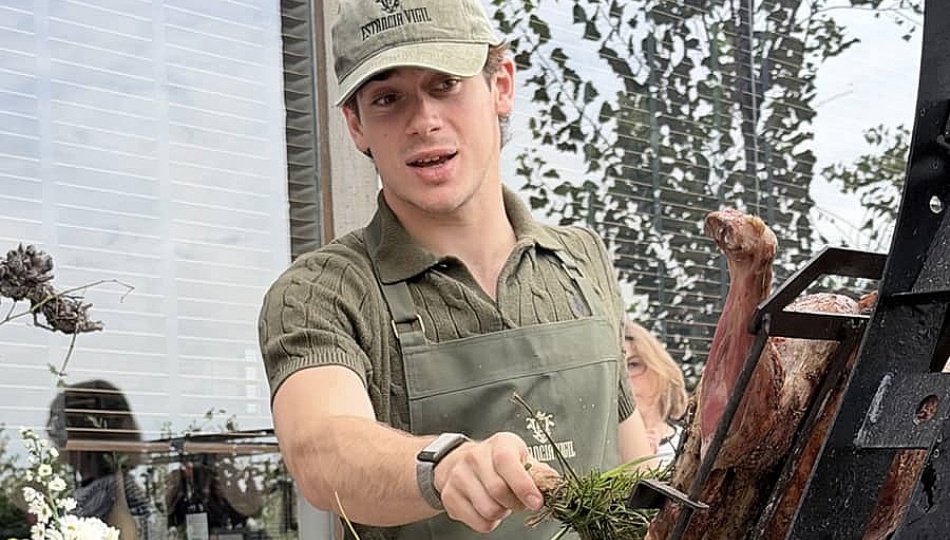 Antes del almuerzo, Colapinto recorrió el predio, los viñedos y la bodega, donde incluso brindó una entrevista para el equipo oficial de la Fórmula 1. Luego, se puso el delantal junto al chef Diego Irato y participó activamente en la preparación del asado.